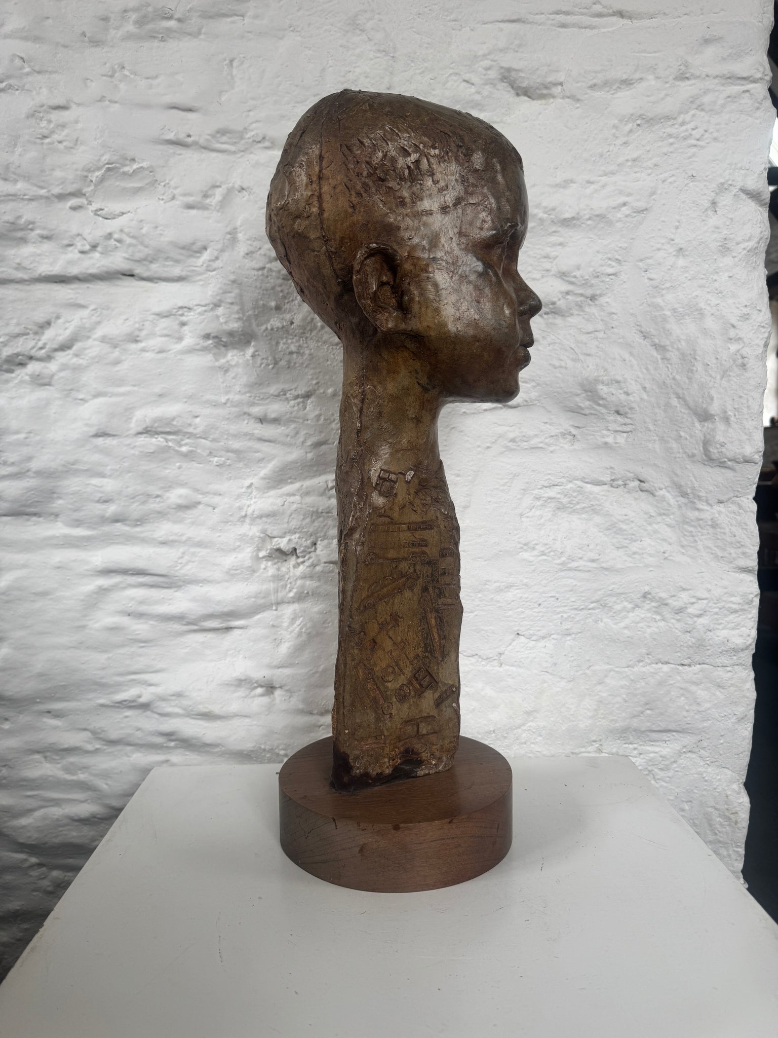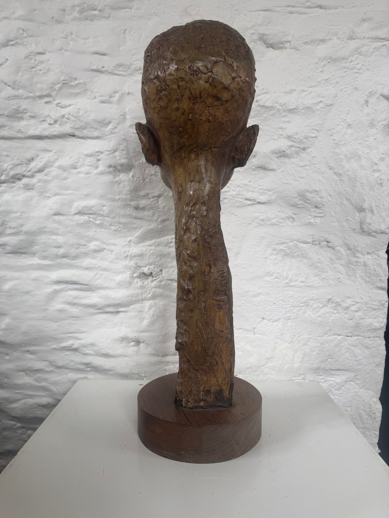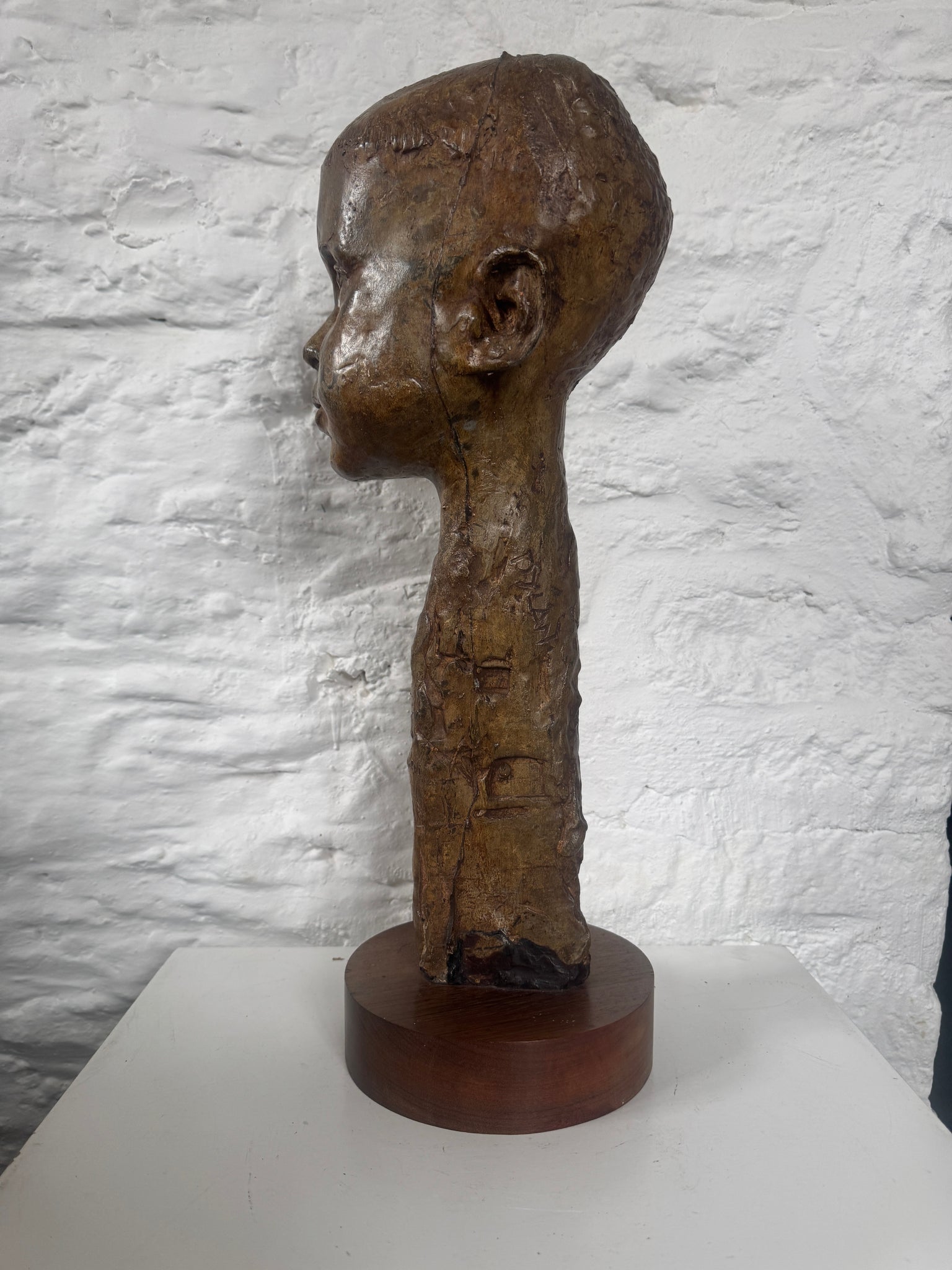 John W. Mills’s Dylan (1956) is an early cast-bronze head that shows the young sculptor’s commitment to intimate, figurative portraiture long before his major public commissions. Catalogued simply as “Head, ‘Dylan’”, it belongs to the period when Mills entered the Royal College of Art (1956) and was refining a supple, hand-modelled surface that reads as tender and direct from life; the title also matches the name of his son, Dylan, born that same year.