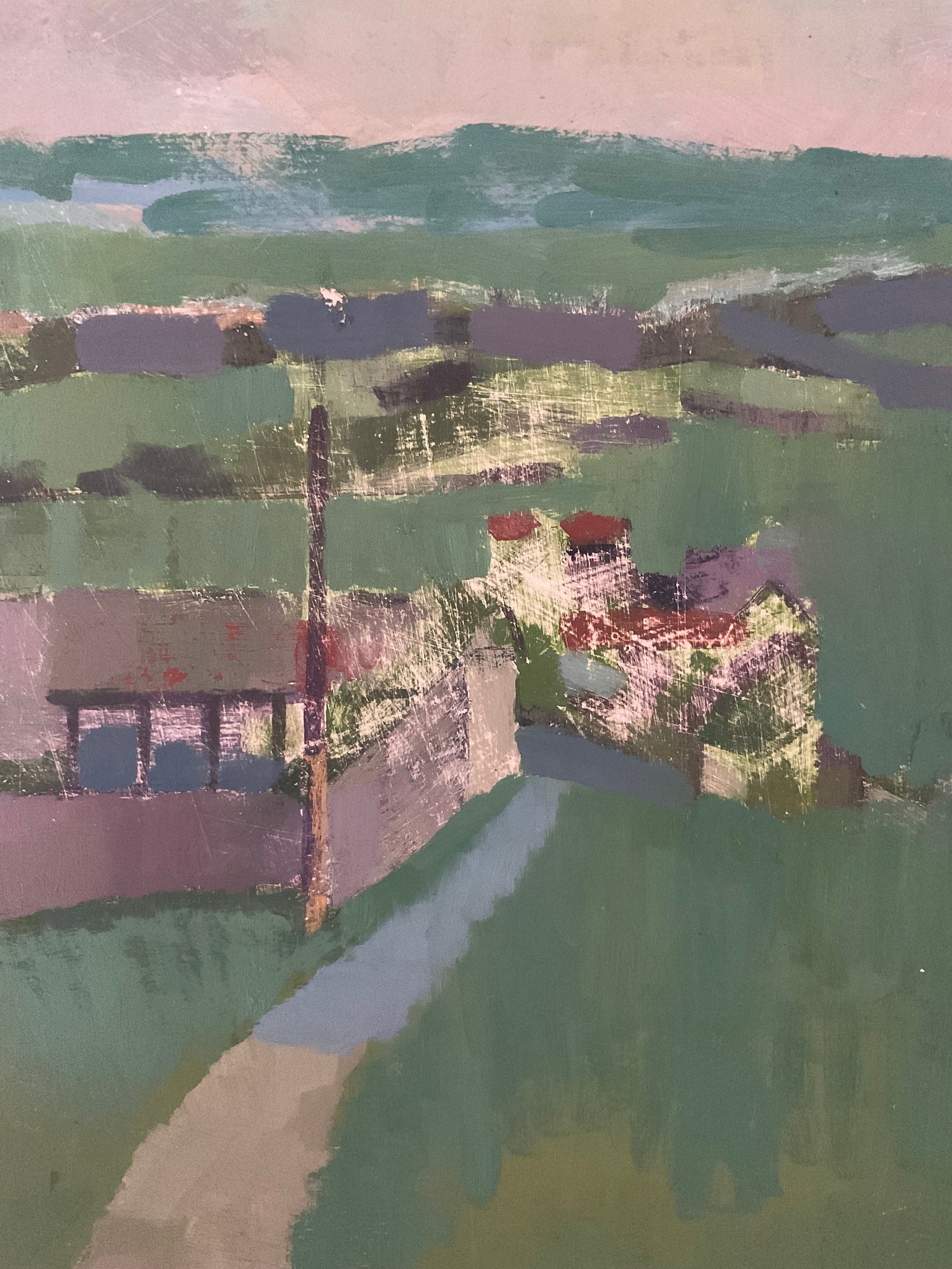 A vintage oil on board by Derek Inwood, renowned for his use of colour. Great composition leads the eye into the heart of the painting.