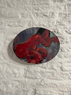 Oil on unusual oval canvas. Nude in pinks and reds/earthy tones. See other similar online if you would like a pair.