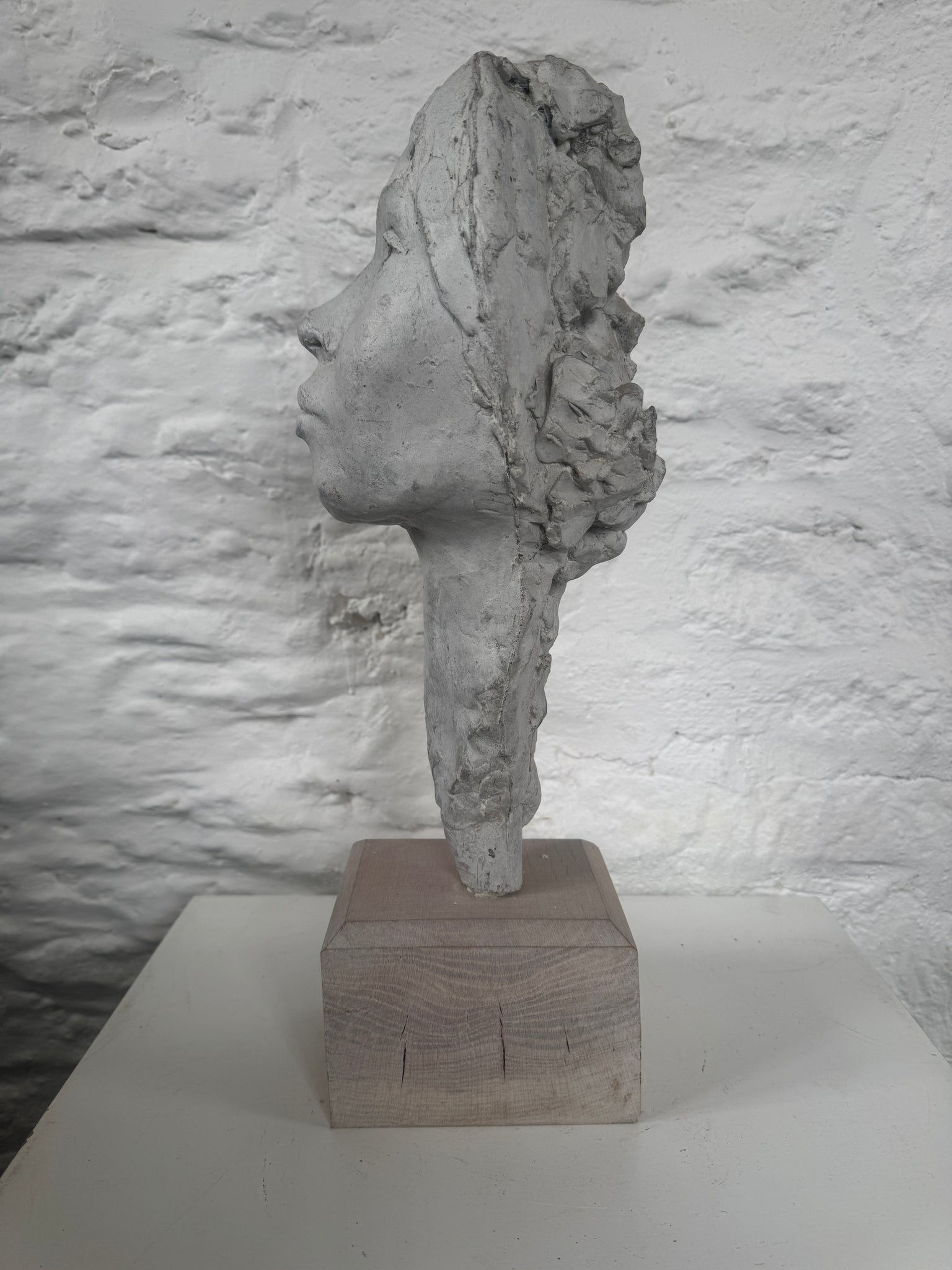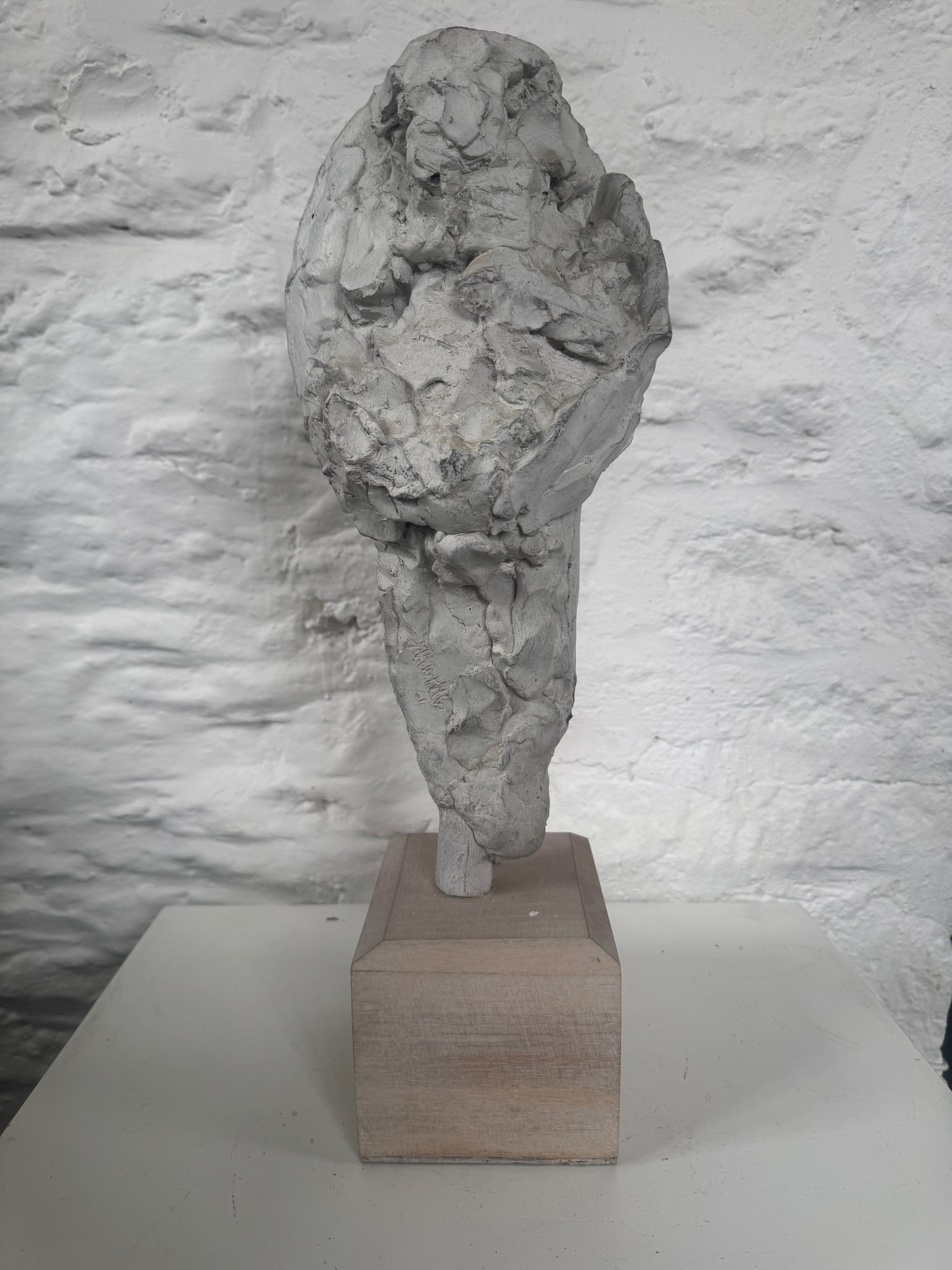 John W. Mills’s Head of a Young Woman with Extended Neck is a studio portrait-bust in painted composite clay set on a wooden base that exemplifies his intimate head studies made alongside his large public commissions. The deliberately elongated neck gives the piece an elegant, upward lift and a sense of poise, while the painted surface and composite medium let Mills model supple features and crisp edges without the weight of bronze.